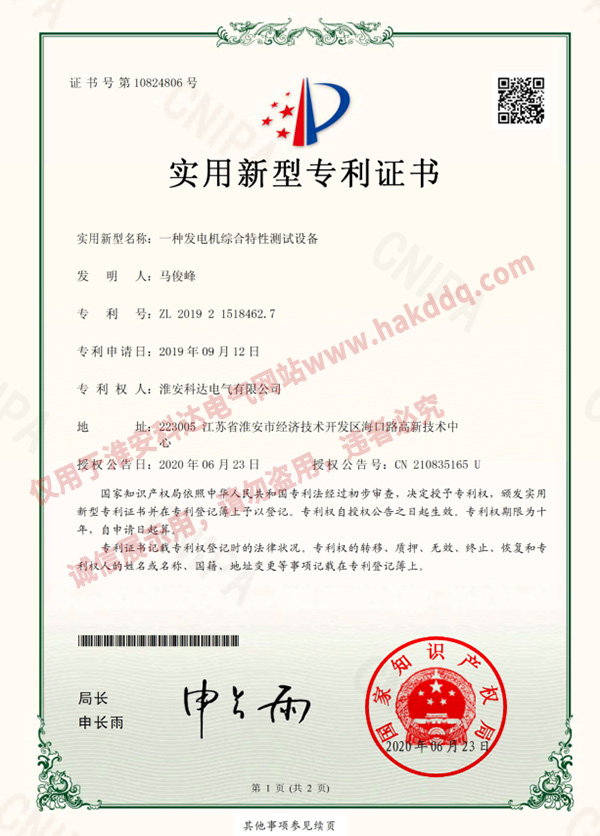 發(fā)電機綜合特性測試設(shè)備專利證書