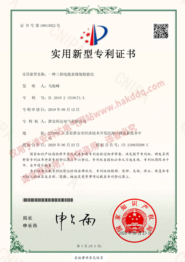 三相電能表現(xiàn)場校驗(yàn)儀專利證書
