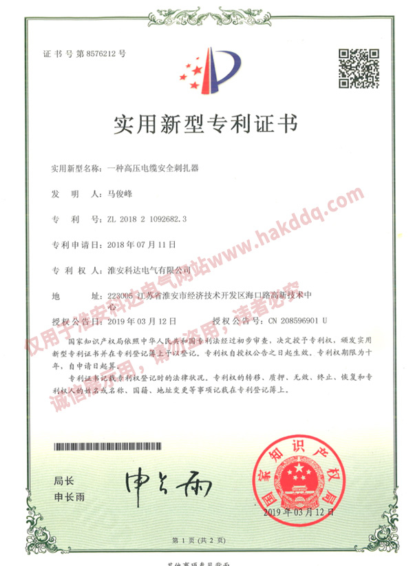 高壓電纜安全刺扎器專利證書
